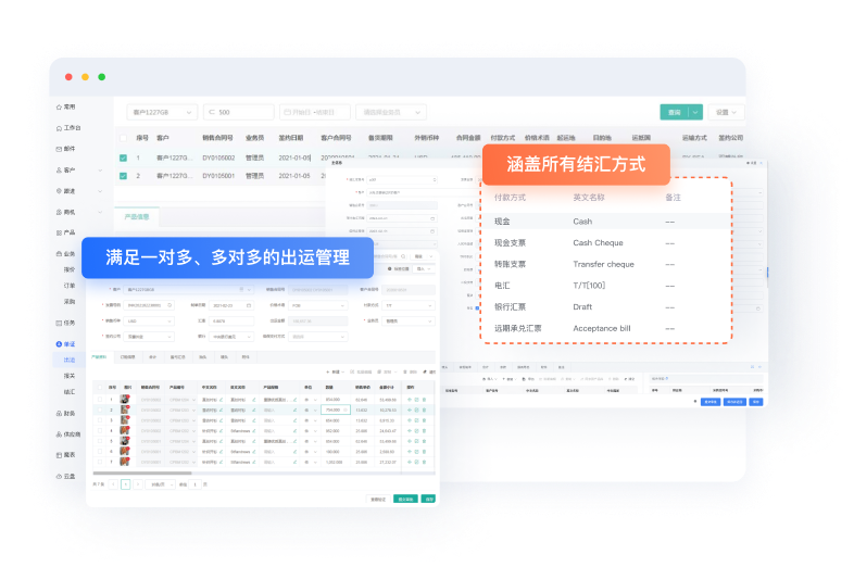 包含出运、报关、结汇等功能,全链路打通数据,一键导入导出