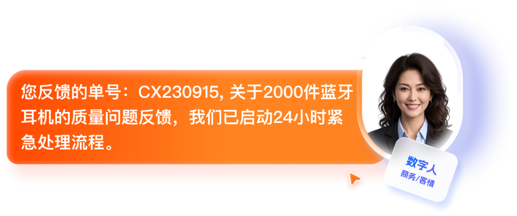 买家提交质量反馈,AI数字人秒级抓取订单号、物流批次、质检报告等,分析判断后,出具报告书;