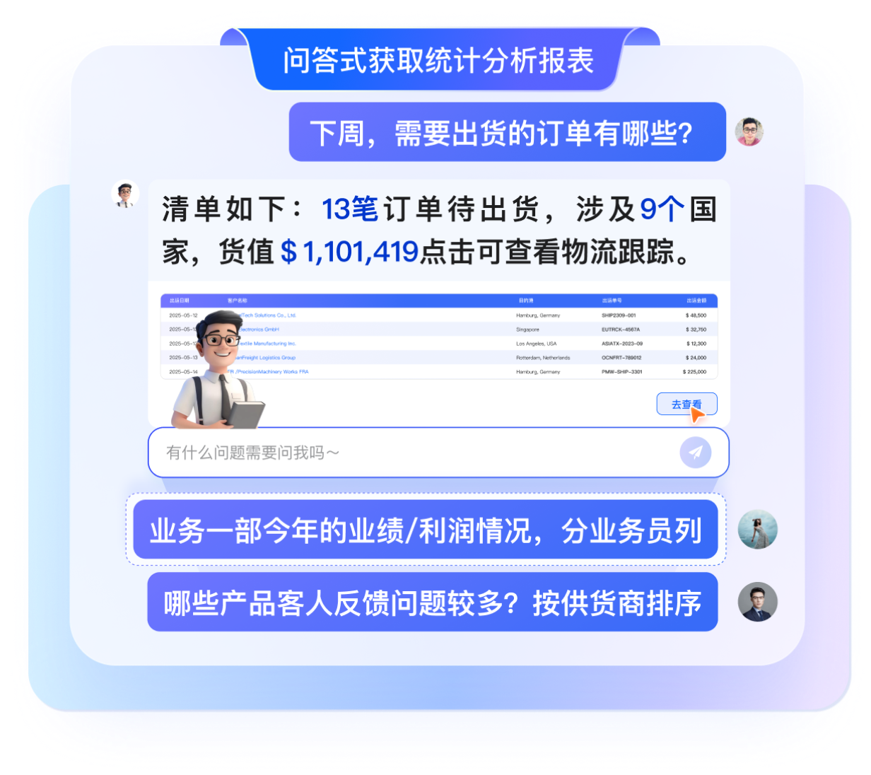 管理者通过自然语言交互提问,AI协管人自动从各业务系统精准检索、提取实时动态数据;