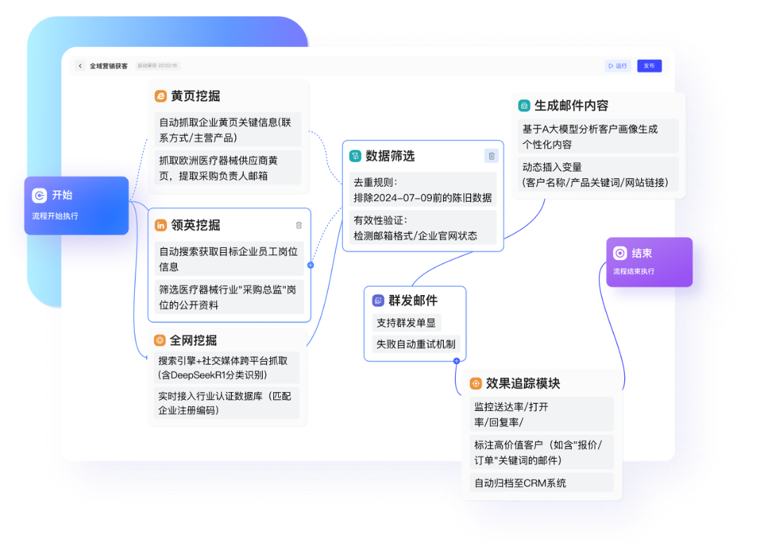 富通天下外贸AI Agent开发平台提供灵活的业务编排能力,通过可视化的操作界面,简单的拖拽式组合各类功能、节点、工具等,实现复杂业务流程的精确编排,帮助外贸企业快速配置贴合自身业务需求的专属Agent。