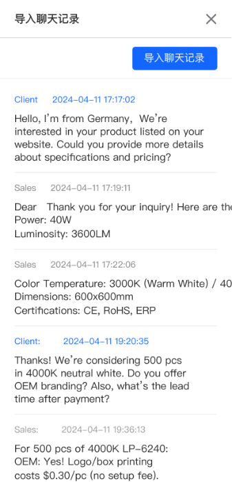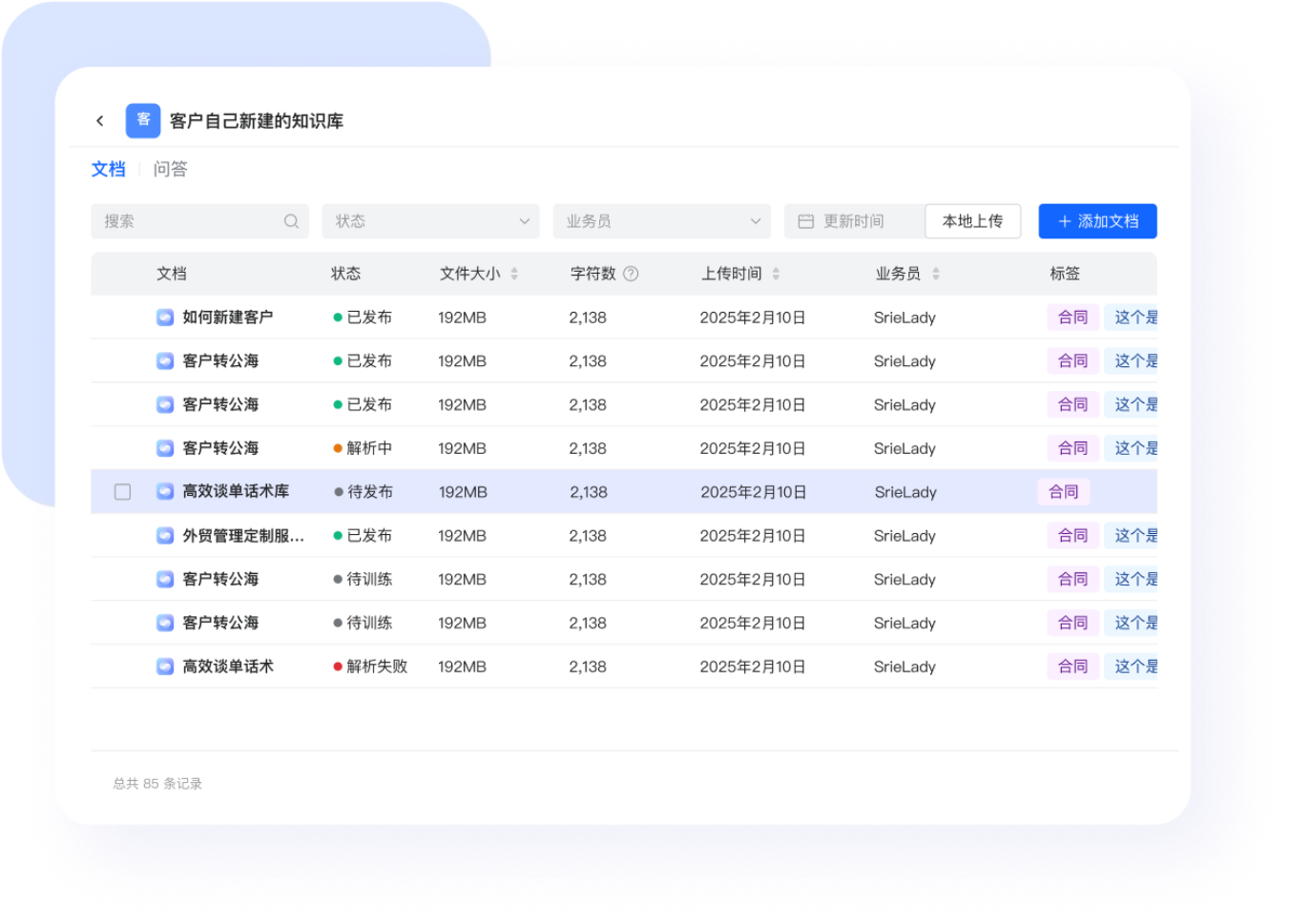 支持整合独立站聊天记录、多渠道客户沟通记录、云平台产品数据,外部文档等,形成强大的AI知识库,让AI能举一反三。如客户询问认证问题,能关联销售案例;根据客户过往咨询记录,精准推荐产品等。