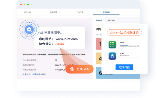 SEO一键检测和评分量化,检测项目多达50多项,覆盖SEO全部关键点