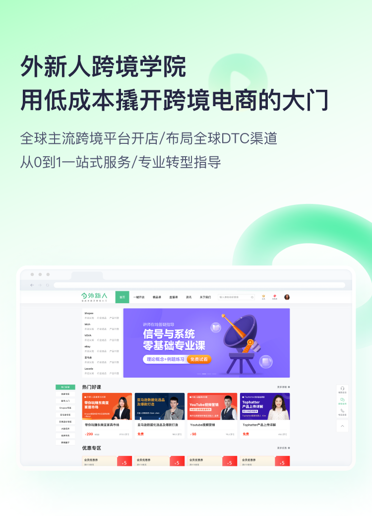 以培养优秀跨境电商人才为己任,凭借拥有一线实战经验的优质教研团队,为千万学子提供海量优质课程。外新人跨境电商在线教育平台提供零基础新手课程、中高阶课程,从入门到进阶再到精通,跨境电商学习者都能在外新人找到想要的课程。